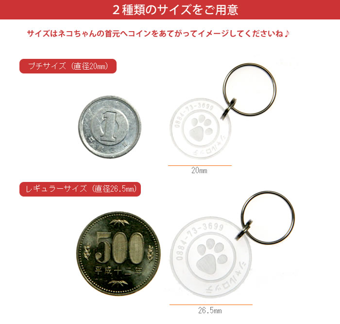 サイズ プチサイズ 外径:20mm 厚さ:3mm(1円玉サイズ) レギュラーサイズ:外径:26.5mm 厚さ:3mm(500円玉サイズ) 重さ プチサイズ 約3g(金具込) レギュラーサイズ:約4g(金具込) プレートカラー クリア クリアブルー クリアピンク 取り付け金具 二重リング 彫刻内容 最大3項目+肉球マーク 1.ペットのお名前 2.電話番号 3.飼い主名 4.肉球マーク(希望があれば) 彫刻可能記号 全角:!”#$%&’()=−〜¥@「」+*<>?/○x☆